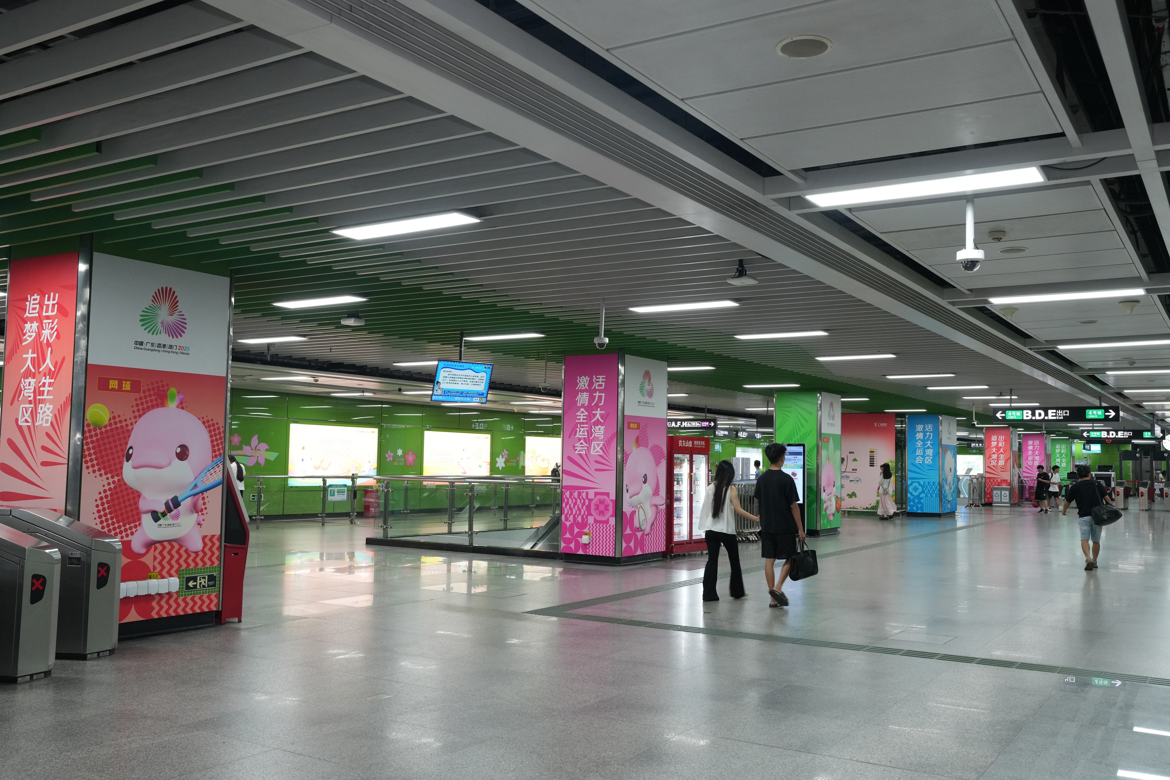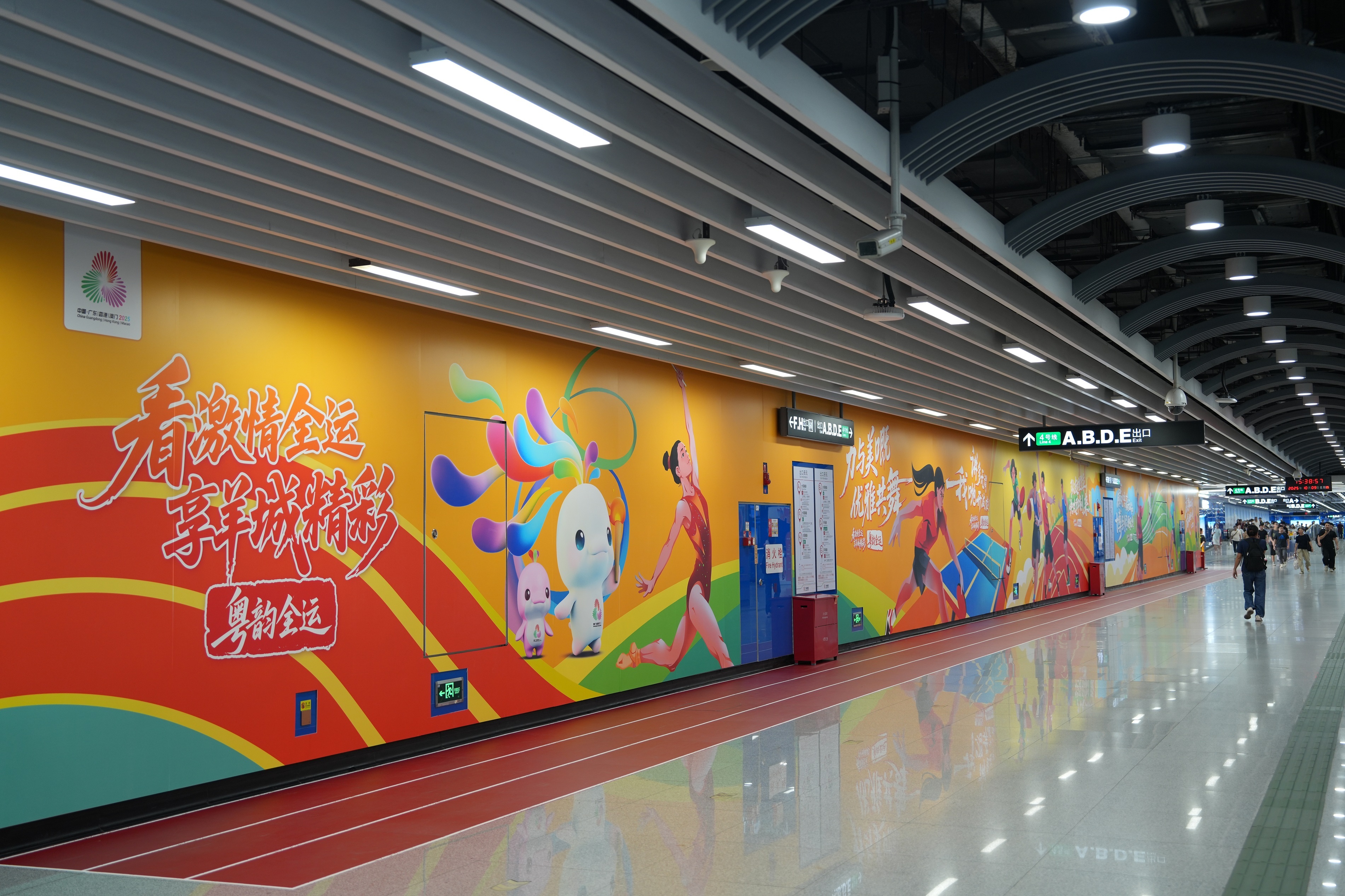 在直达奥体中心的黄村站D、E口趣投顾,缤纷流动的彩带铺满了通道,既呼应运动赛场的速度与激情,也象征着广州城市的蓬勃生机。吉祥物喜洋洋与乐融融沿墙排列,宛如在欢迎全国各地的运动健儿、观众及游客朋友。楼梯区域采用绿、粉、红、蓝四色大色块拼接设计,简洁明快,与全运元素相映成趣,形成强烈的视觉冲击。