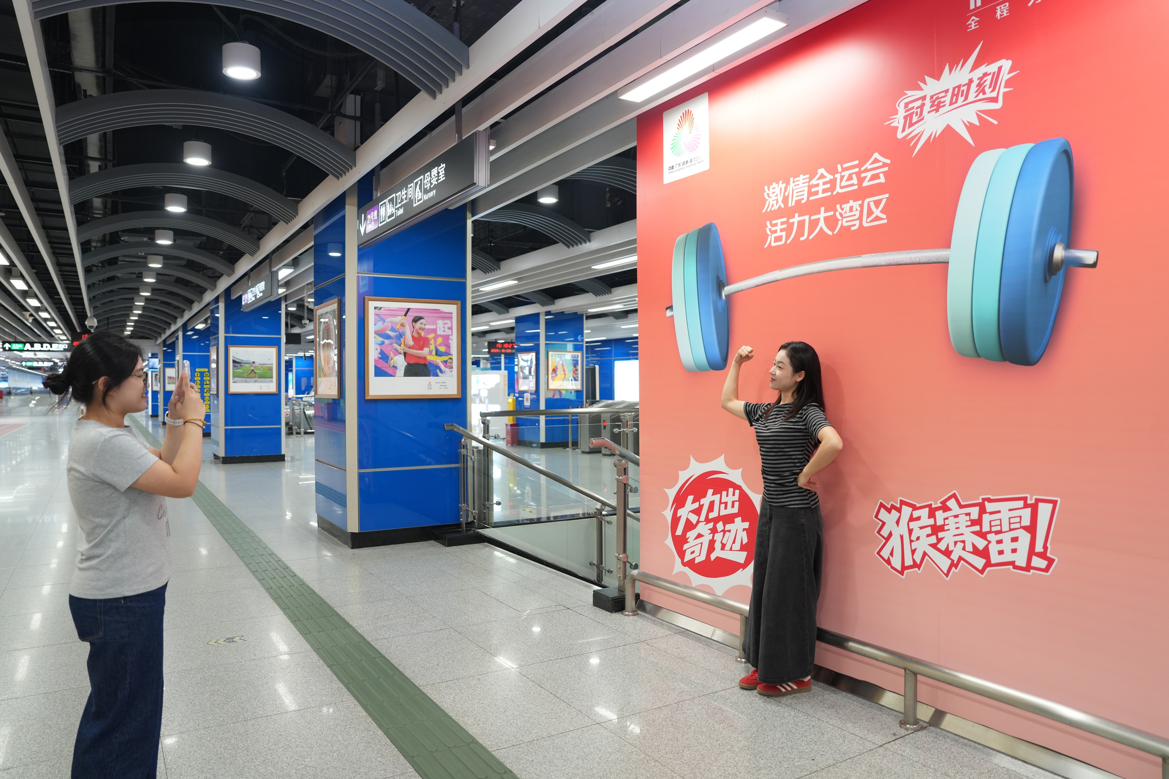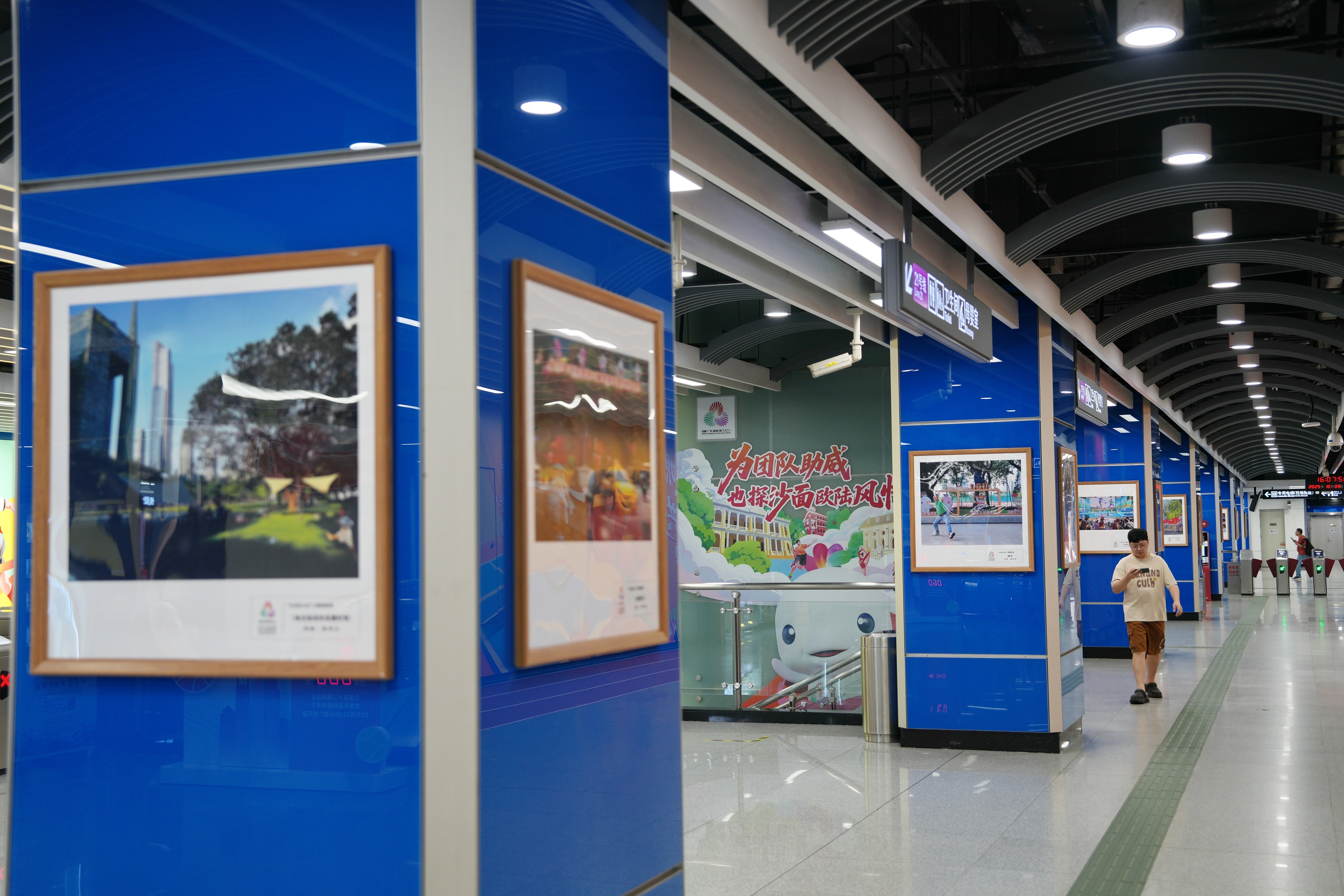 二十一号线站厅的“粤韵全运”展区,以地道粤语为切入点,结合日常运动场景,打造“一词一运动”的趣味表达,让全运氛围融入市井烟火,展现广州独有的语言文化与运动热情。同时,“全民拍全运”主题摄影展也在该区域展出,集中展示了面向社会征集的全运会主题摄影作品,从300余幅投稿中精选出70余幅佳作,以公众视角捕捉全运精彩瞬间。