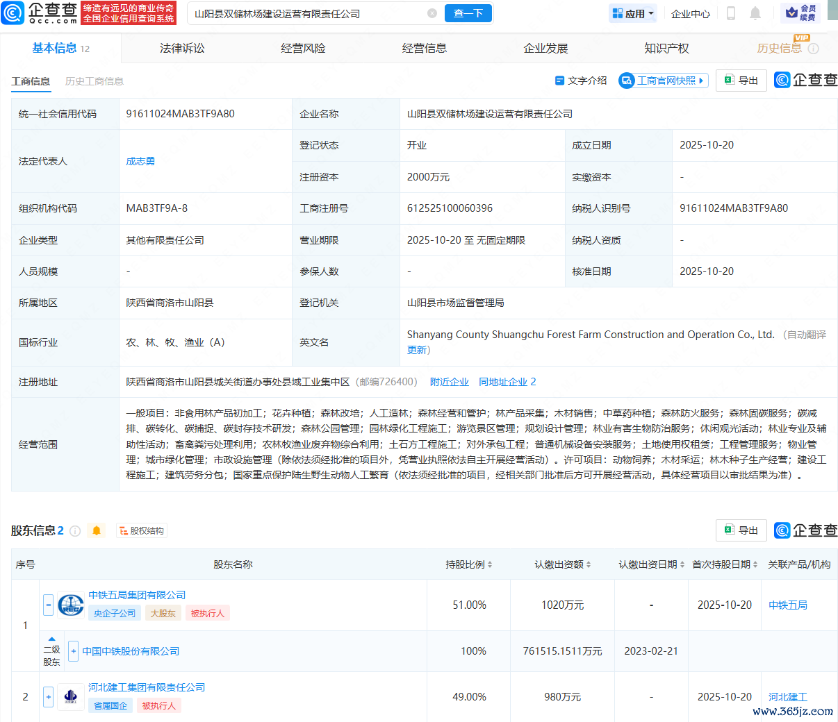 近日,山阳县双储林场建设运营有限责任公司成立,法定代表人为成志勇赤盈配资,注册资本为2000万元,经营范围包含:花卉种植;森林改培;人工造林;森林经营和管护;林产品采集;木材销售;中草药种植等。企查查股权穿透显示,该公司由中国中铁(601390)全资子公司中铁五局集团有限公司、河北建工集团有限责任公司共同持股。
