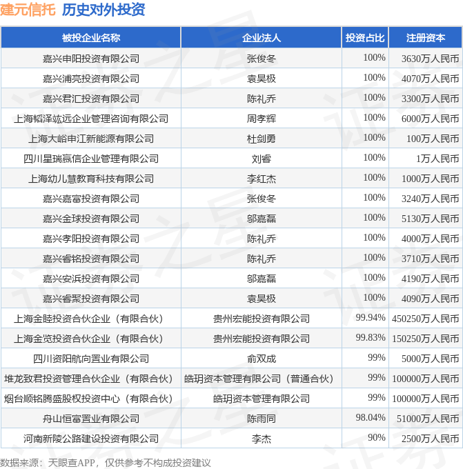 本站消息满盈网配资,根据天眼查APP显示,建元信托(600816)新增一起对外投资事件满盈网配资,被投资公司为上海海立集团资产管理有限公司,法定代表人鲍伟,投资占比为51%。该公司从事商务服务业,注册资本为16095.5688万人民币。目前,建元信托共存在对外投资58项,投资占比前20的项目见下表: