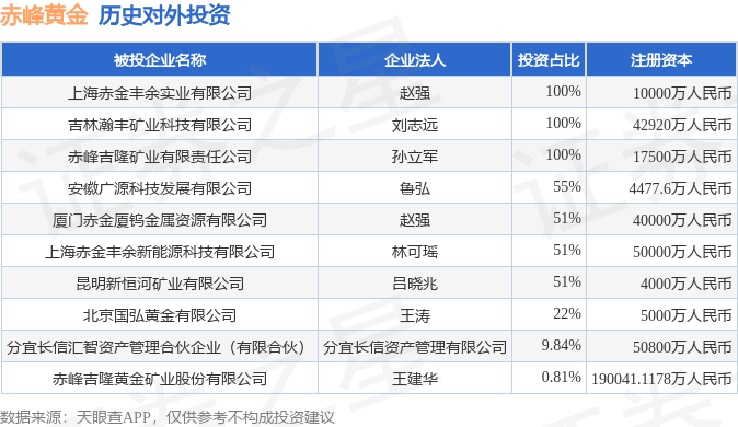 本站消息,根据天眼查APP显示,赤峰黄金(600988)新增一起对外投资事件,被投资公司为赤峰吉隆黄金矿业股份有限公司,法定代表人王建华,投资占比为0.81%。该公司从事有色金属矿采选业,注册资本为190041.1178万人民币。目前,赤峰黄金共存在对外投资10项红太阳配资,详见下表: