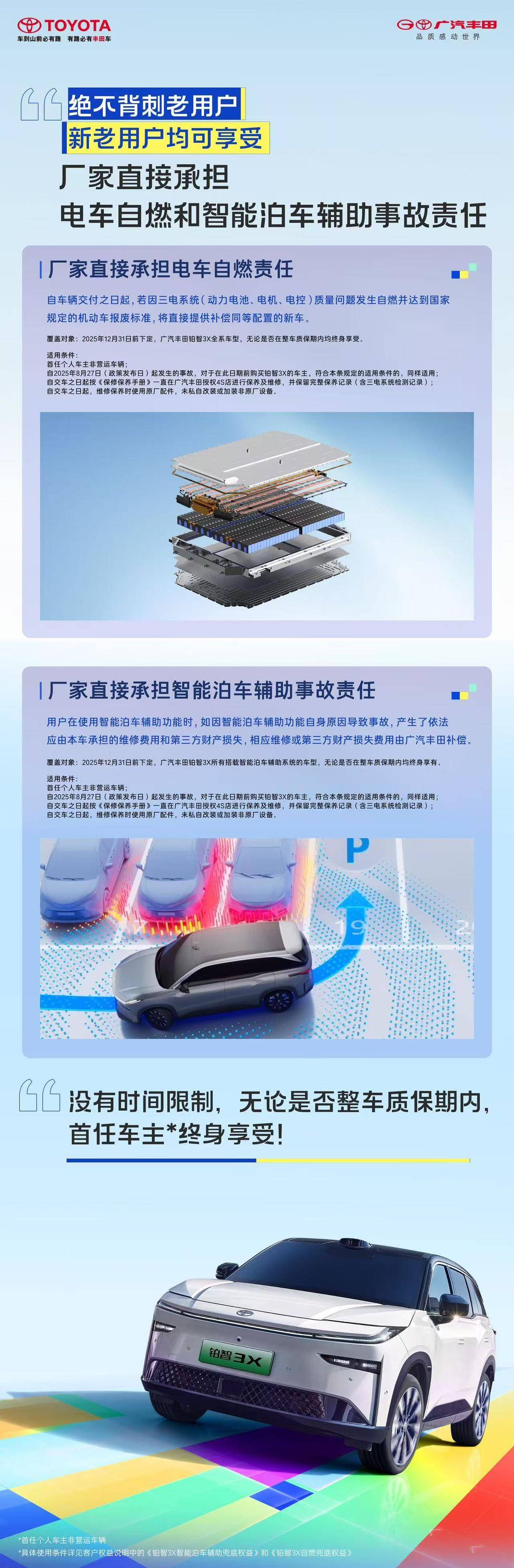 在消费者仍对电动车存有“安全焦虑”之时,今天,广汽丰田在#铂智3X首次用户大会#上亮出重磅王牌:厂家直接承担电车自燃责任,直接承担智能泊车事故责任。这份重磅承诺覆盖面广,无论是新老用户(限首任车主),且无论是否处于整车质保期内,均可终身享有。